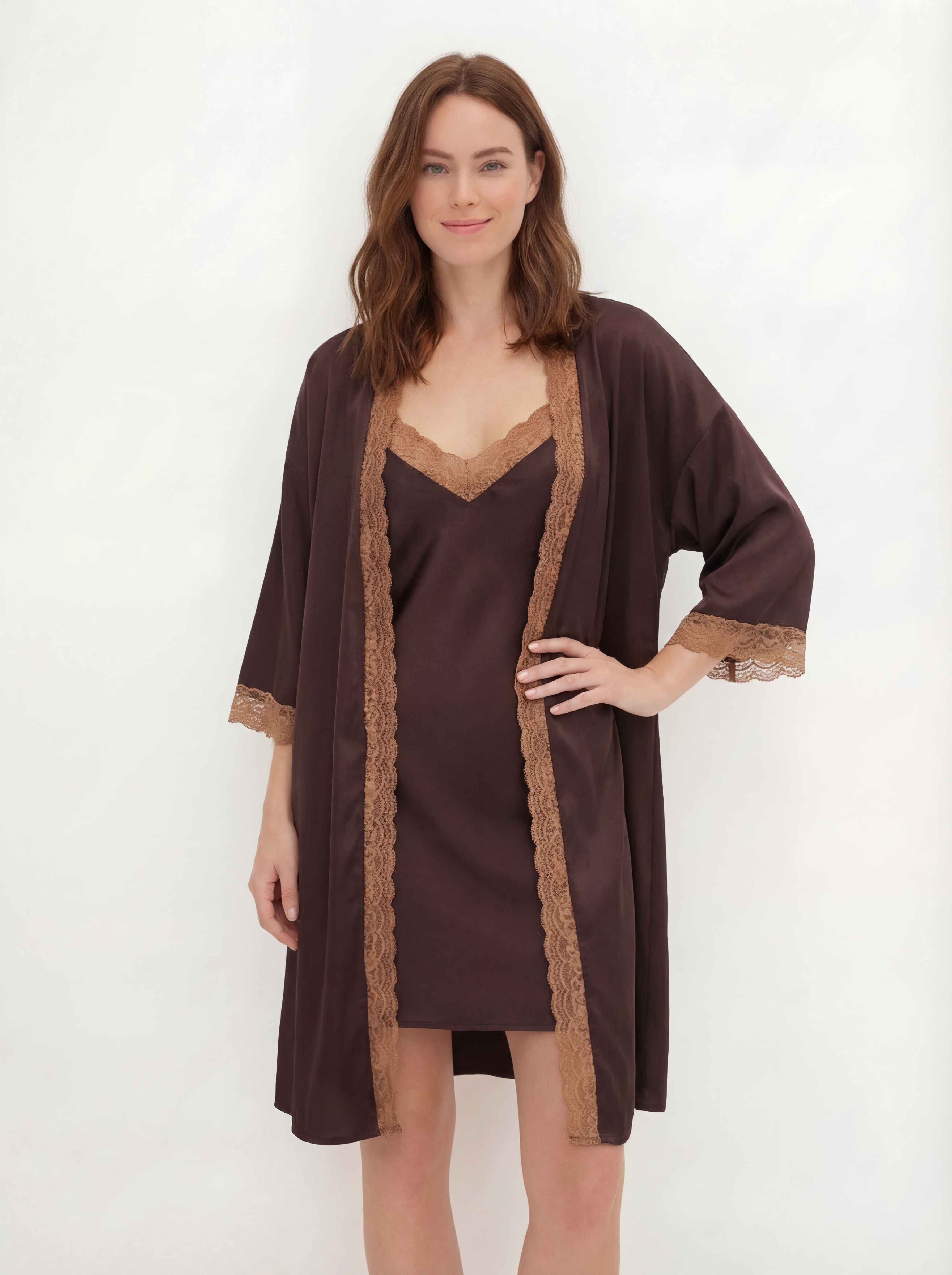 Subtilus šokolado spalvos šilkinio satino žvilgėjimas įneš spalvų į kasdienybės rutiną. Chalatas dekoruotas sendinto aukso spalvos, aukštos kokybės nėriniais. Žaismingumas ir elegancija viename.