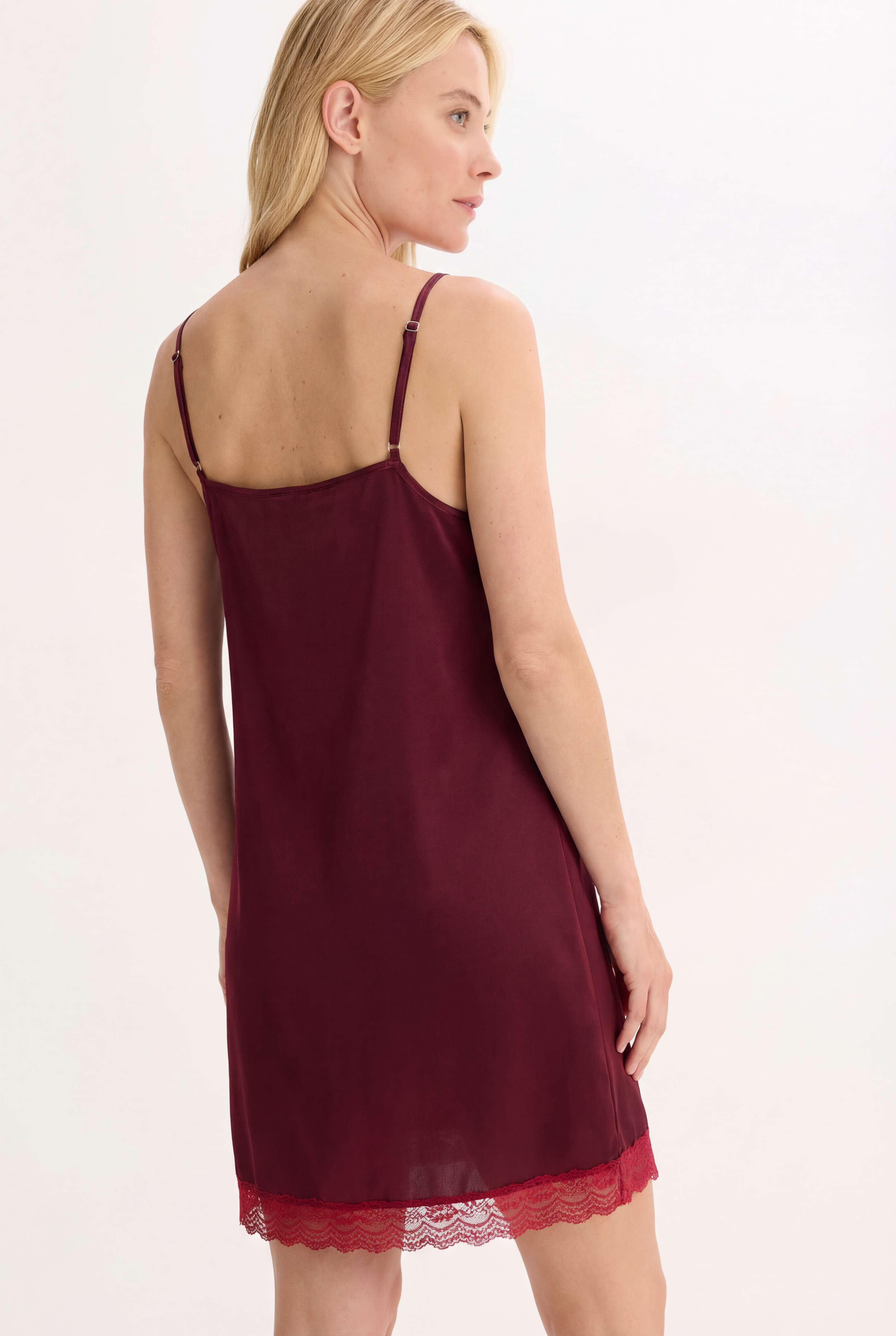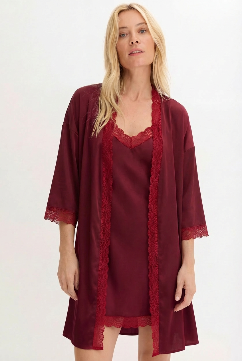 Subtilus tamsiai bordo spalvos šilkinio satino žvilgėjimas suteikia kasdienybei sodrios prabangos pojūtį. Tiek chalatas, tiek naktinukai dekoruoti rausvais, aukštos kokybės švelniais nėriniais, kurie įvaizdžiui suteikia romantiško žaismingumo ir elegancijos. Žaismingumas ir elegancija viename. Komplektą sudaro chalatas ir naktinukai, o reguliuojamos petnešėlės leidžia patogiai pritaikyti drabužį prie kūno linijų ir mėgautis komfortu.
