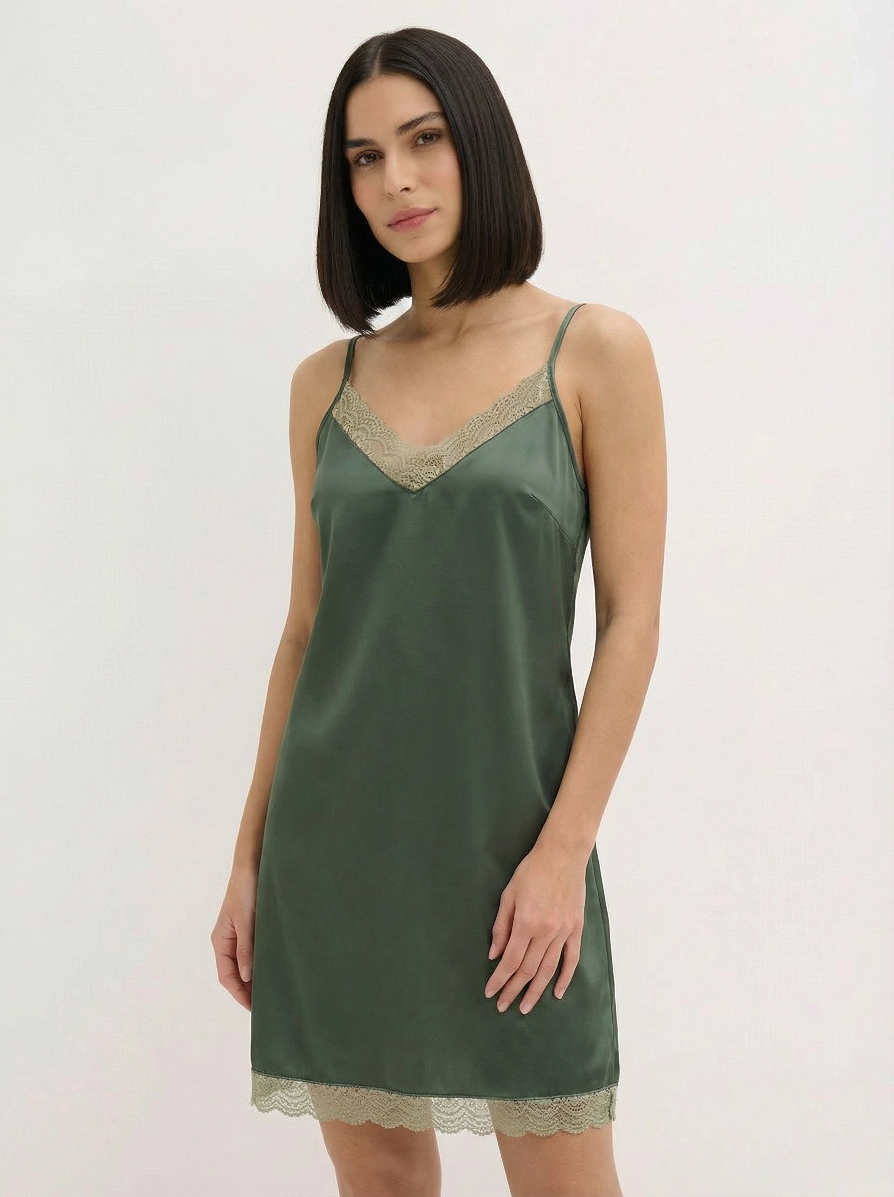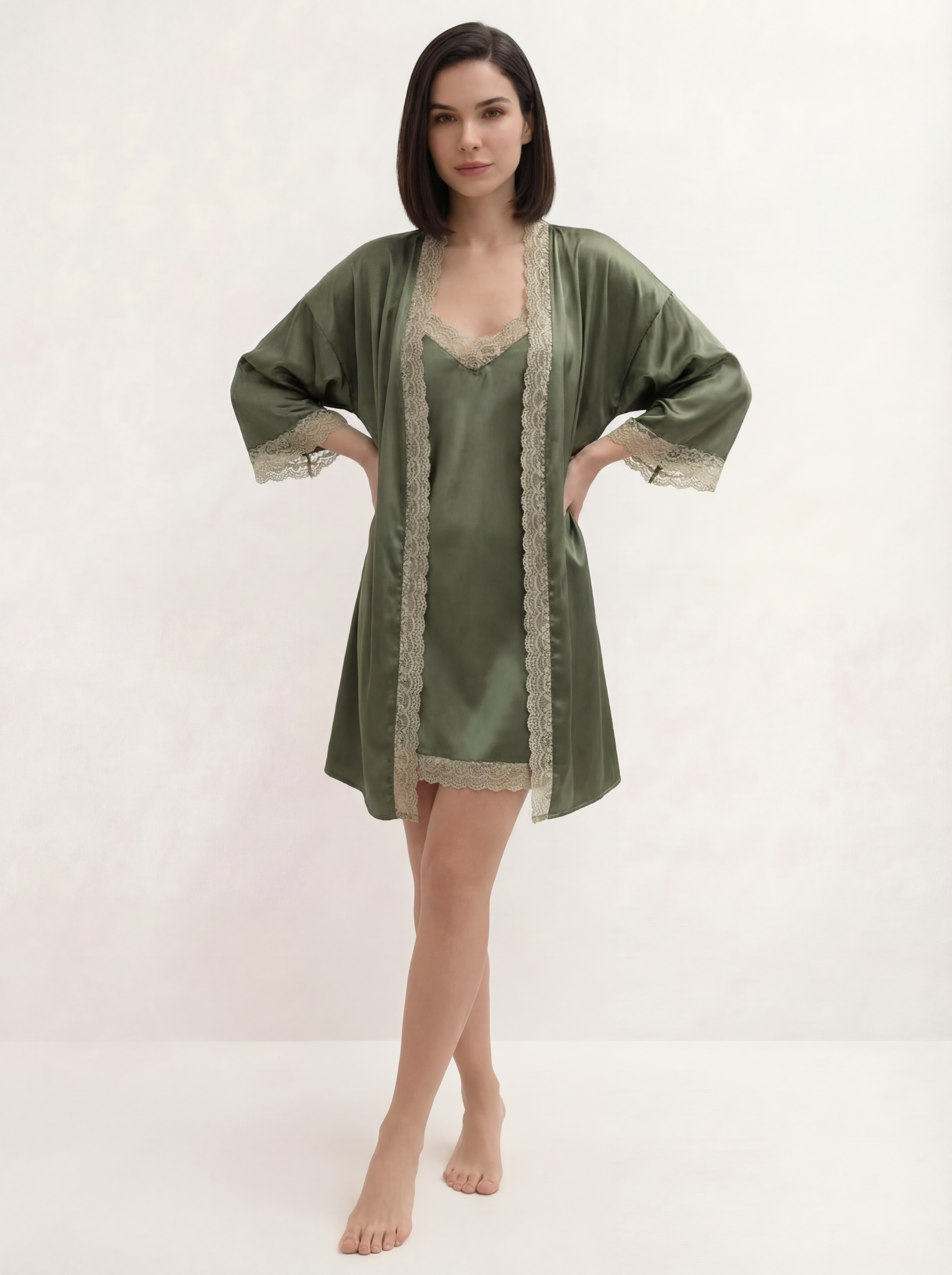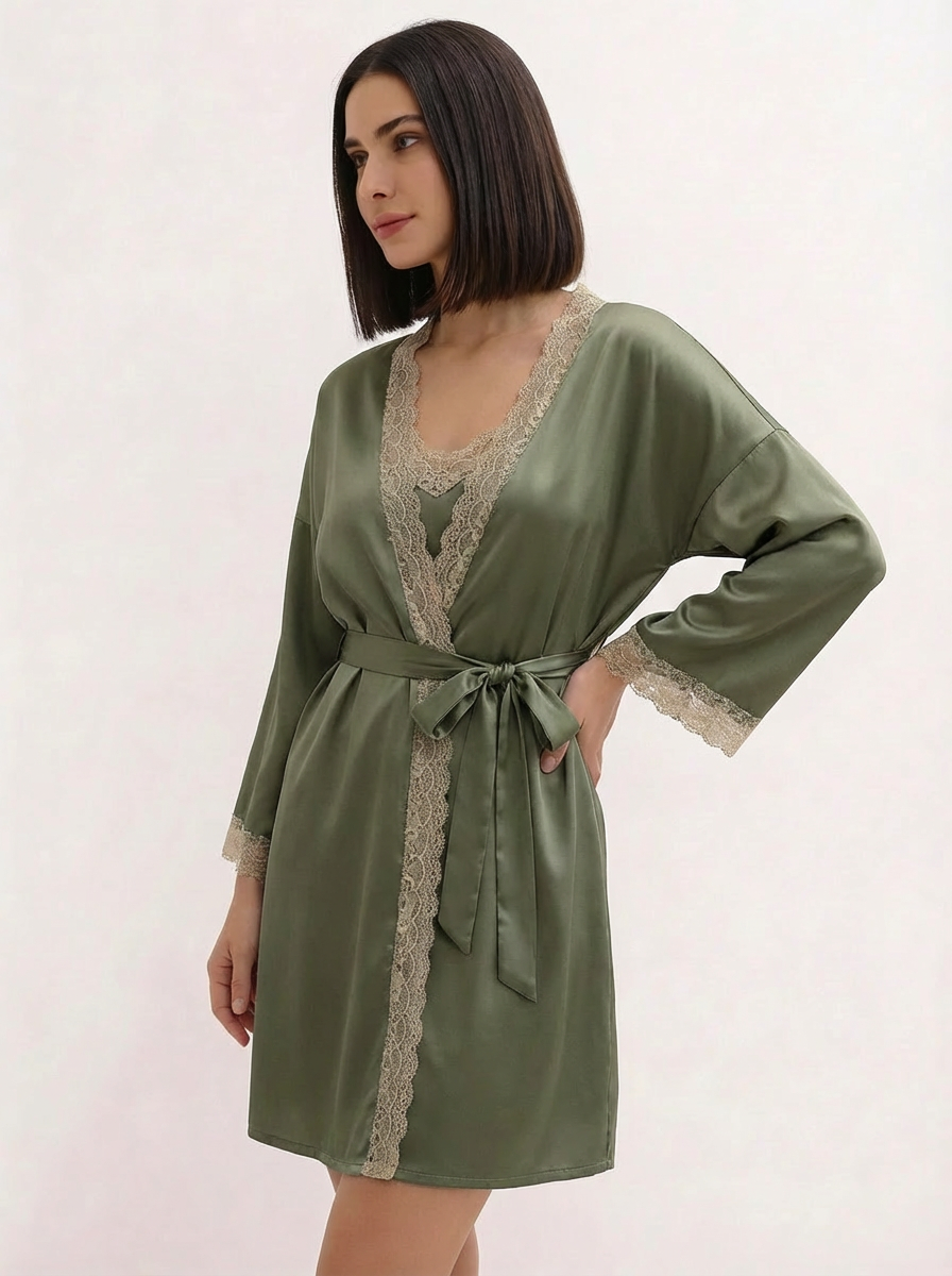 Subtilus pistacijų spalvos šilkinio satino žvilgėjimas įneš spalvų į kasdienybės rutiną. Tiek chalatas, tiek naktinukai dekoruoti priderintos spalvos, aukštos kokybės švelnučiais nėriniais. Žaismingumas ir elegancija viename. Komplektą sudaro chalatas ir naktinukai. Reguliuojamos petnešėlės leidžia patogiai pritaikyti drabužį prie kūno linijų.