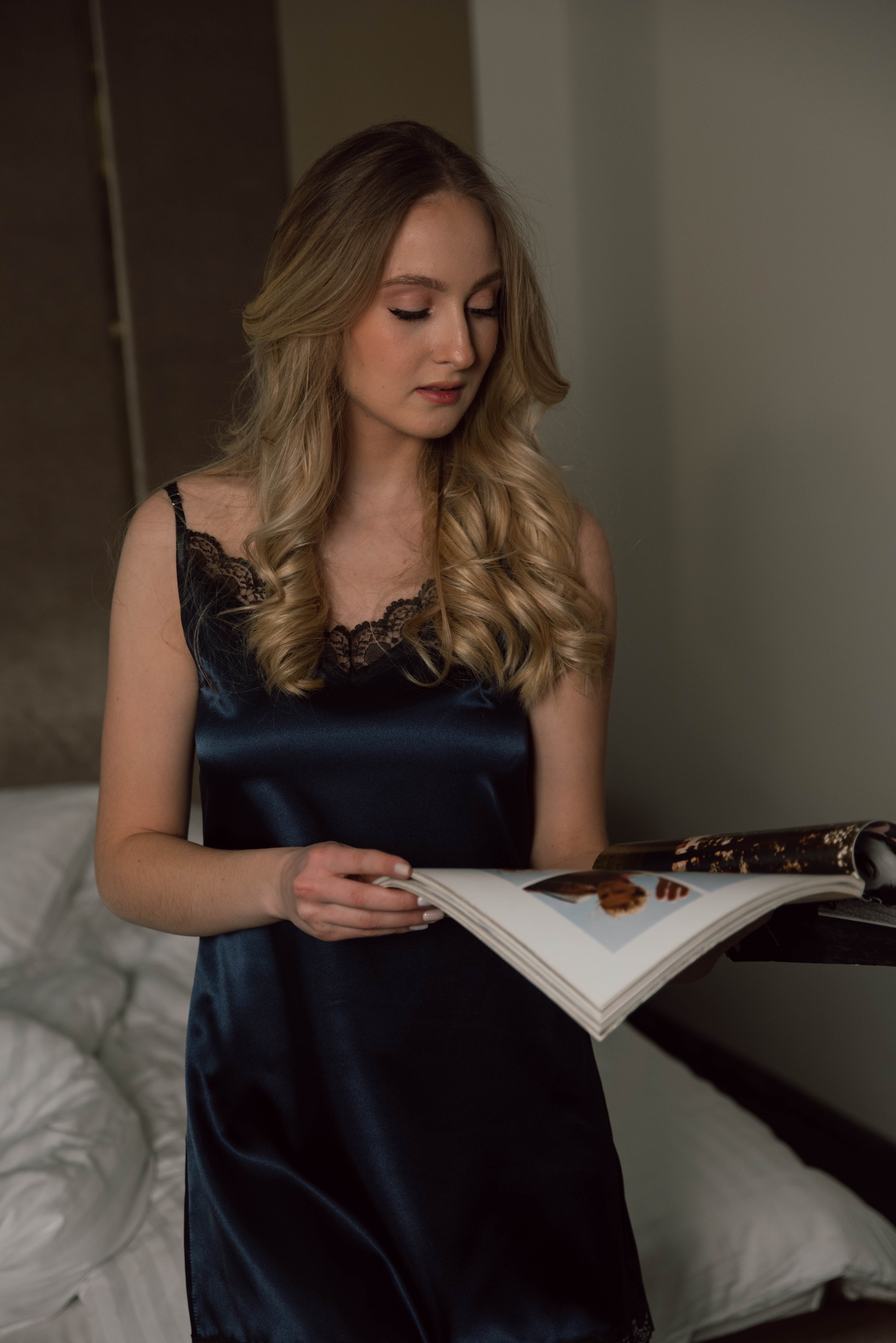 Tamsiai mėlynos spalvos šilkinis satinas spinduliuoja ramybę ir išskirtinį rafinuotumą. Glotnus, subtiliai žvilgantis audinys suteikia elegantišką įvaizdį ir maloniai priglunda prie kūno. Naktinukai dekoruoti juodu nėriniu, kuris dar labiau pabrėžia klasikinį grožį. Reguliuojamos petnešėlės leidžia patogiai pritaikyti drabužį ir jaustis ypatingai kiekvieną dieną.
