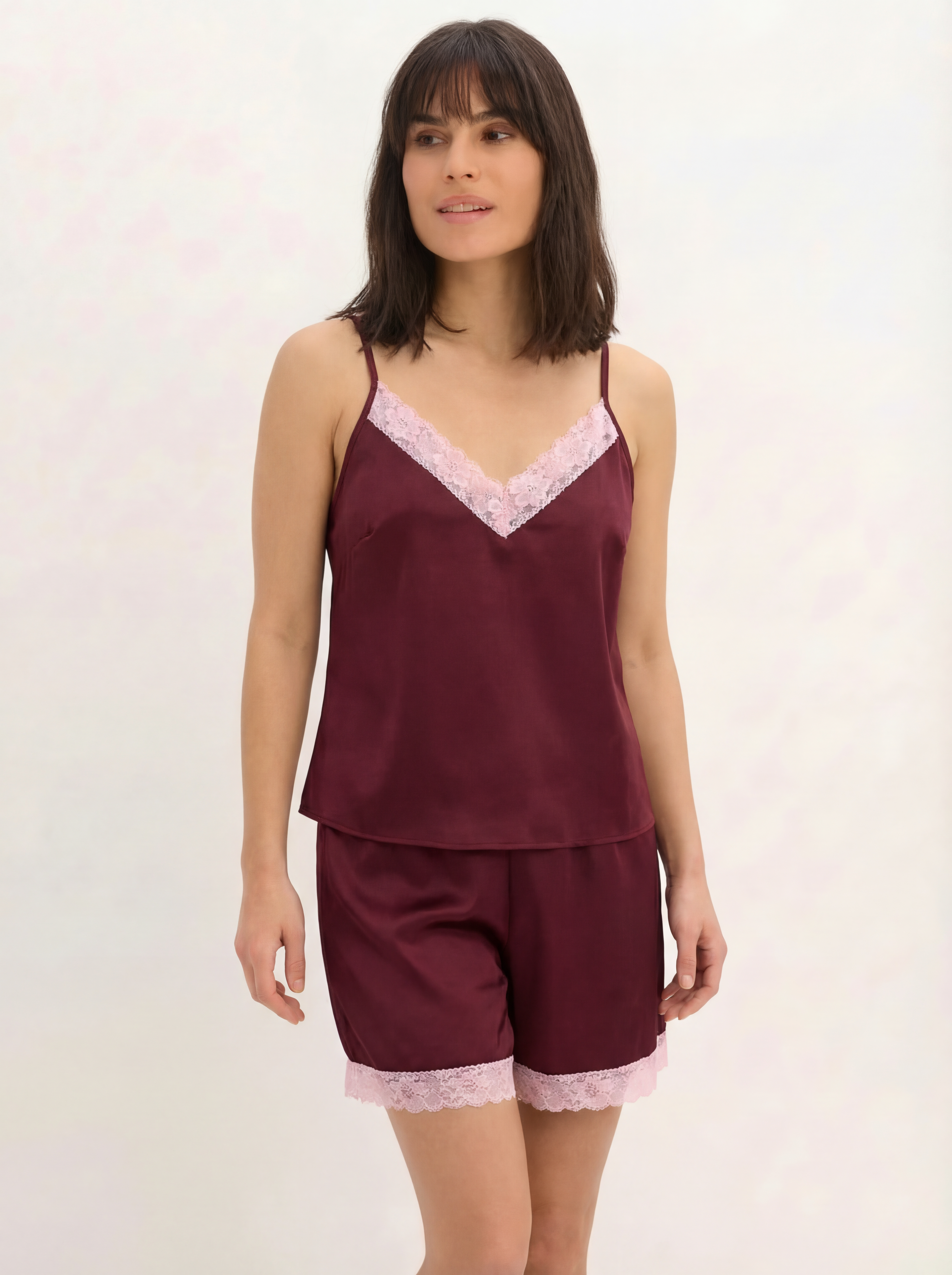 Karališkas tamsiai bordo atspalvis ir subtilus šilkinio satino žvilgėjimas suteikia kasdienybei prabangos pojūtį. Pižama dekoruota švelniais rausvais, aukštos kokybės nėriniais, kurie sukuria elegantišką ir moterišką kontrastą. Patogumas ir elegancija viename. Reguliuojamos petnešėlės leidžia lengvai pritaikyti drabužį prie kūno linijų ir užtikrina maksimalų komfortą.
